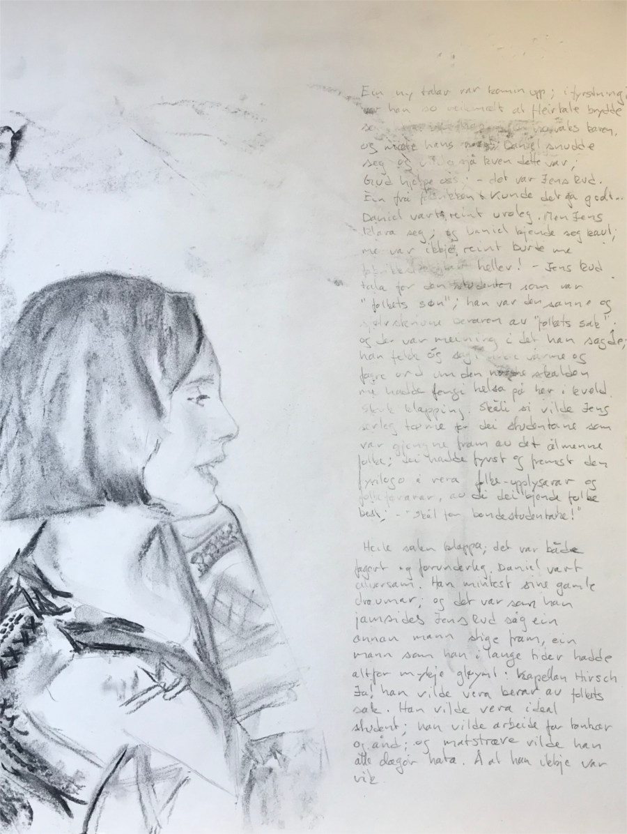 Pencil, charcoal and text by Arne Garborg on paper. 48 x 36 cm. With: Cecilie Fritzner.