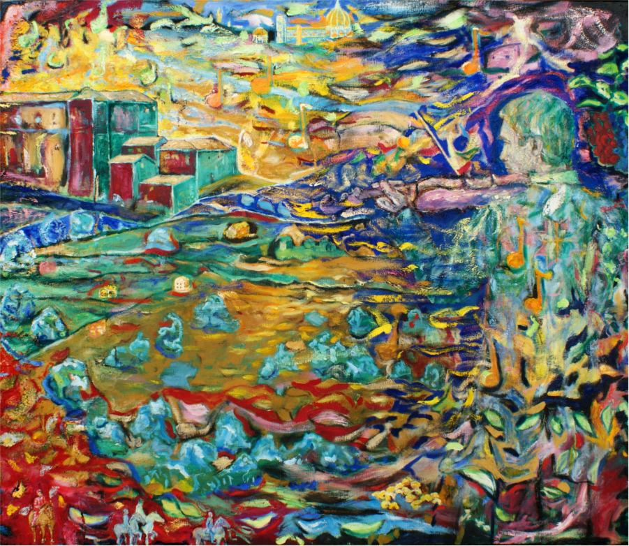 Oil on canvas, ca 98 x 114 cm, cm, 2011. During a pleasant visit to Potentino Castle in Tuscany in 2004 I took on a small design jobb for the castle. But being to unexperienced I did not perform up to standards. To console my sorrow over this I painted Castello di Potentino and Myllarguten. Myllarguten is a mytho-historical Norwegian figure.