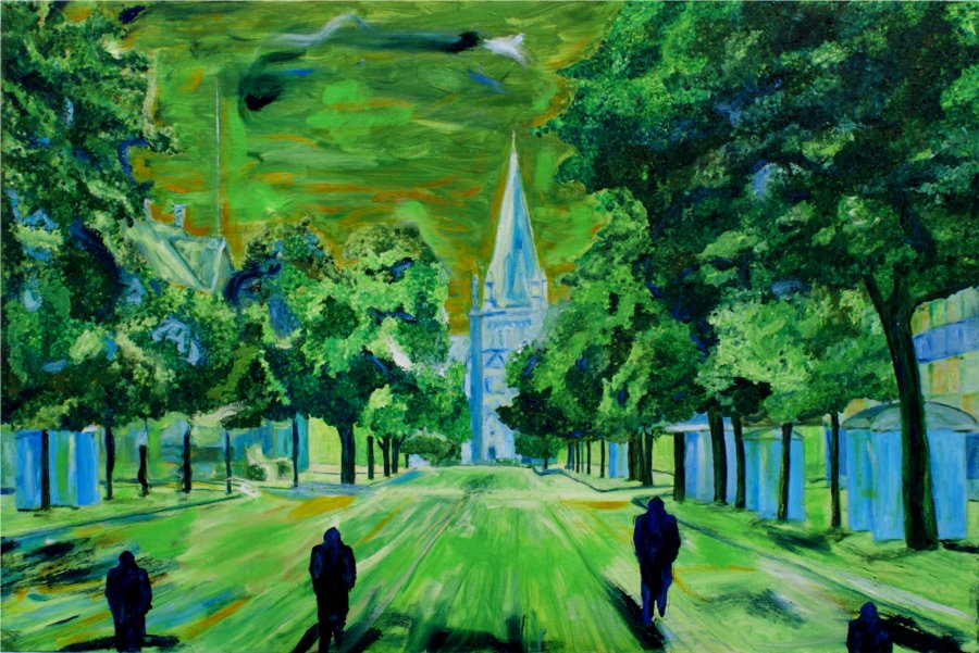 Oil on canvas, 80 x 120 cm, 2011. The dark men in the painting represent the silhouette of James Dean, which again was the logo of the nightclub "Frakken", where I had my two aprentice years as bouncer after I quitted my naval architect career because I wanted to become a painter artist. This two year periode became a kind of rite de passage.