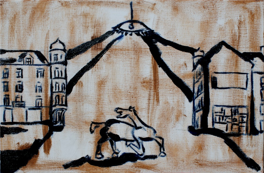 Oil on canvas, 30 x 45 cm, 2014. Obviously inspired by Picasso's great artwork Guernica, this painting confronts the local politicians unimpressive treatment of the cultural and architectural legacy in Trondheim.