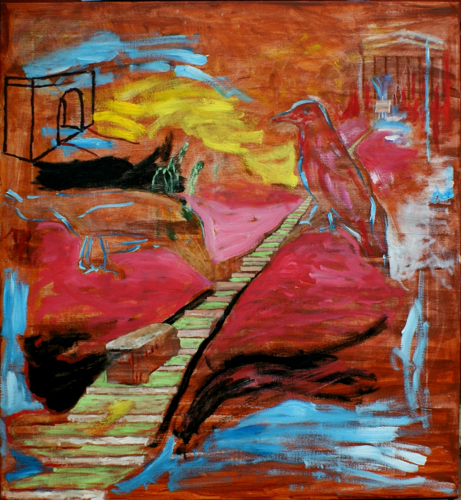 Oil on canvas, 92,5 x 100 cm, 2009. In 2000 I went on a longer excursion to France. The tour went with an old veteran minibus and was full of experiences. When my paintings eventually started to tell stories, the minibus from this tour became the first symbol I took into use.
