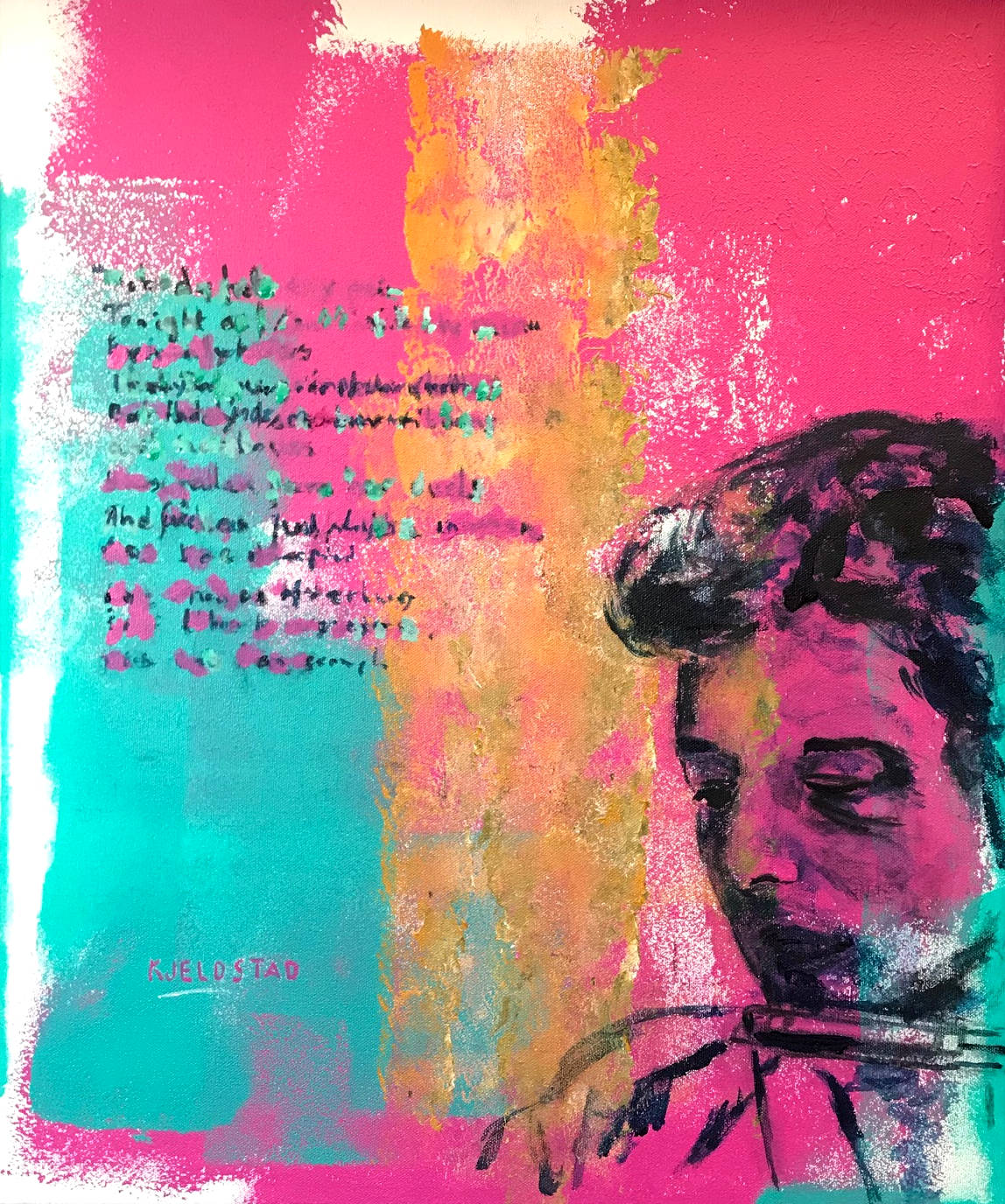 Acrylics on Canvas, 55 x 46 cm, 2019. The painting of Bob Dylan is painted after a photo on Wikipedia taken by Rowland Scherman: Civil Rights March on Washington, D.C. closeup view of vocalists Joan Baez and Bob Dylan, 08/28/1963. Record holder is U.S. Information Agency. Press and Publications Service.