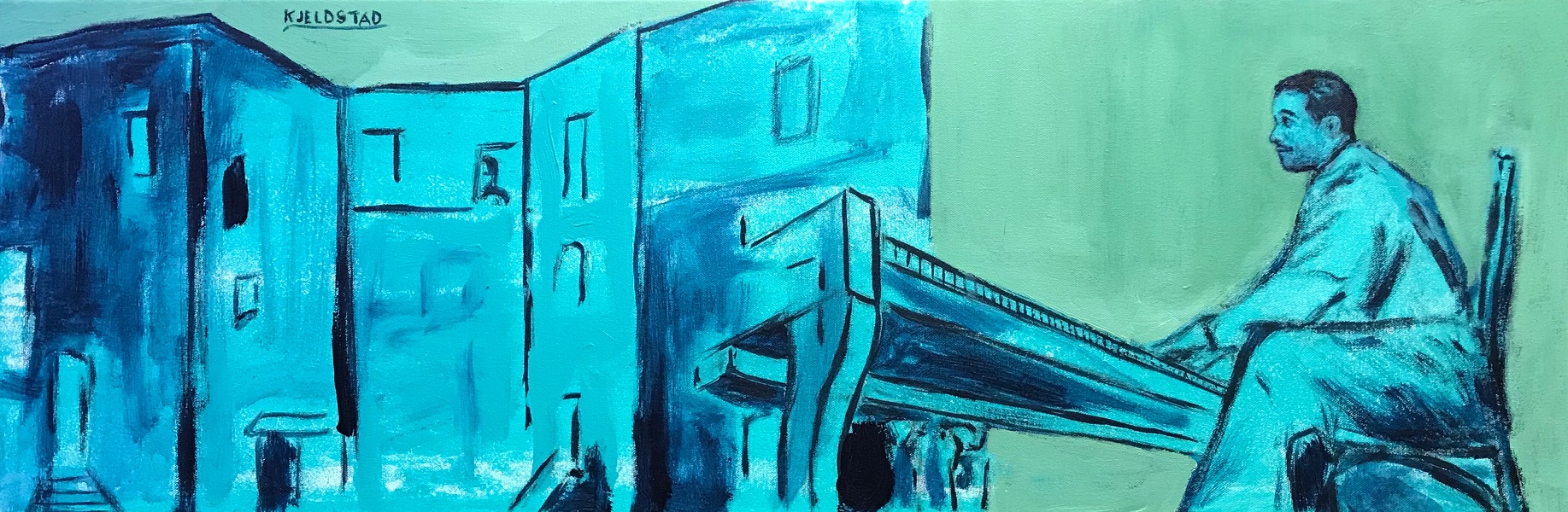 Acrylics on canvas, 30 x 90 cm, 2019. The portrait of Duke Ellington is painted after photos on Wikipedia showing Duke Ellington at the Hurricane Club 1943 and Duke Ellington directing his band at the Hurricane Club.