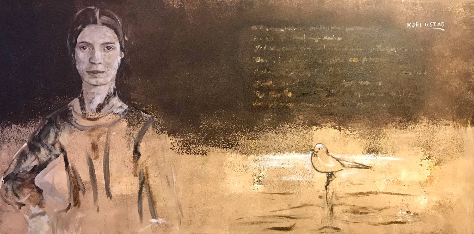 Acrylics on canvas, 2020. The portrait of Emily Dickinson is painted after an image on Wikipedia displaying a Daguerrotype of Emily Dickinson, c. early 1847. It [the Daguerrotype] is presently located in Amherst College Archives & Special Collections. The poem “Tell all the Truth but tell it slant —” by Emily Dickinson is from https://en.wikisource.org/wiki/Tell_all_the_Truth_but_tell_it_slant. The digital version of the painting is available under the Creative Commons Attribution-ShareAlike License.