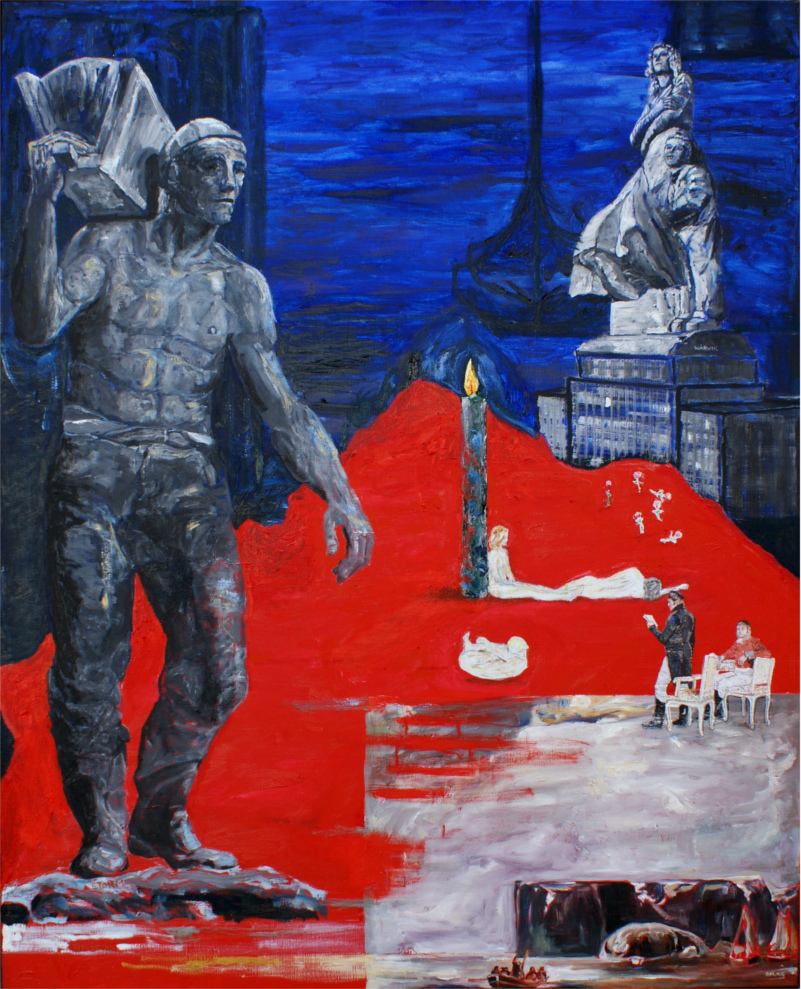 Oil on canvas, 155 x 125 cm, 2015. Through the darknes of the tragedy at Utøya shone the greatnes of humanity; young ones saving the lives of teenagers, teenagers saving the lives of kids. This image shows images from the history of Norway and the labour party and movement. The young members of AUF where gathered at Utøya to develop politics and democracy for the future. This spirit will continue and is what we will build our democracy on.