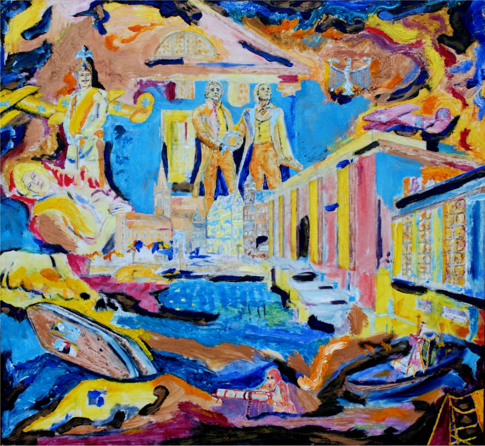 Oil on wood, 52,5 x 57 cm, 2011. The Weimar republic was the symbol of the land of poets and thinkers. A democratic achievment in it self, replaced by the third reich. Reading Antony Beevor's Berlin - The Downfall catalyzed this painting.