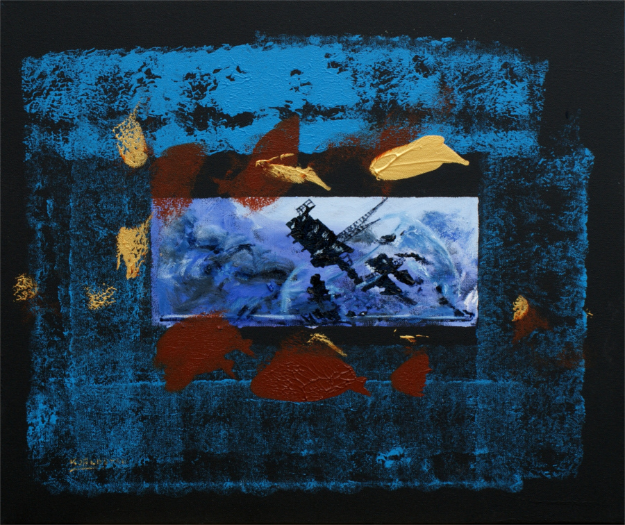 This painting was inspired by my exhibition in Chernivtsi where the Fishbowlship paintings series was seen in relation to innovation and design.It is further inspired by the Helmuth von Moltke the Elder quote "no plan survives contact with the enemy". Lastly, we lean of course, heavily on Pearl Harbour iconography. Acrylics and oil on canvas, 46x55 cm, 2016.