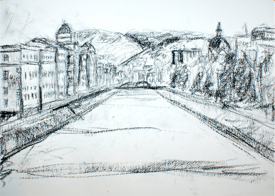 Charcoal on paper, 30 x 40 cm, 2014. Elegant and silent is the Sarajevo river. Running down from the winter sport paradise mountains surrounding the city.