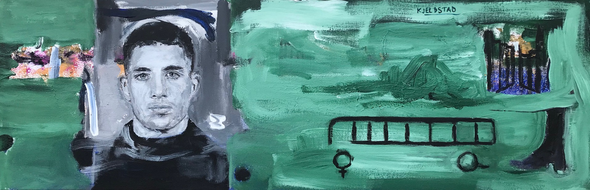 Acrylics on Canvas, 30 x 90 cm, 2019, The portrait of Jack Kerouac is painted after a photo on Wikipedia originating from US National Archives.
